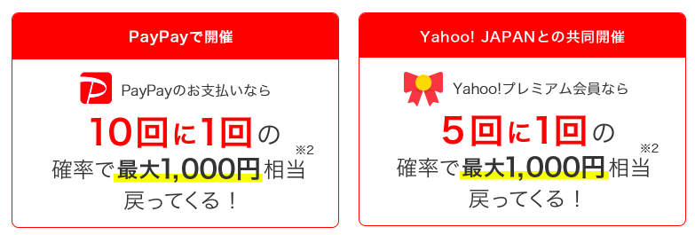 このキャンペーンの付与上限額は1回あたり1,000円相当、キャンペーン期間中の付与合計上限額は「PayPayで開催」キャンペーンと「Yahoo! JAPANとの共同開催」キャンペーンあわせて20,000円相当です!